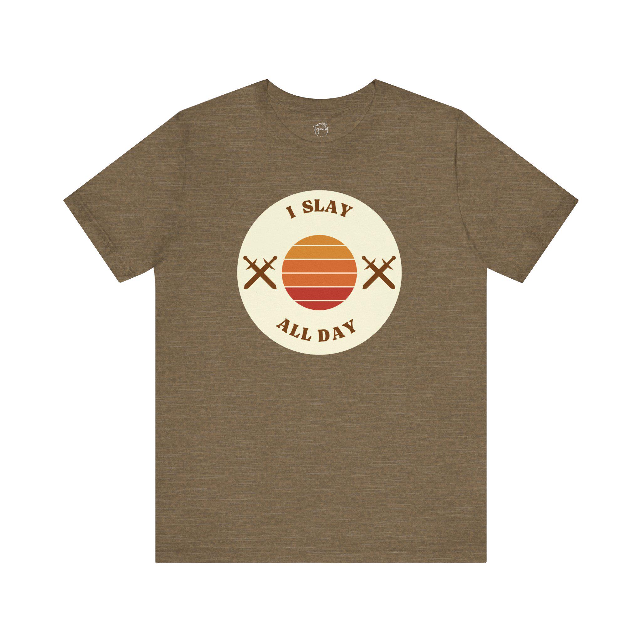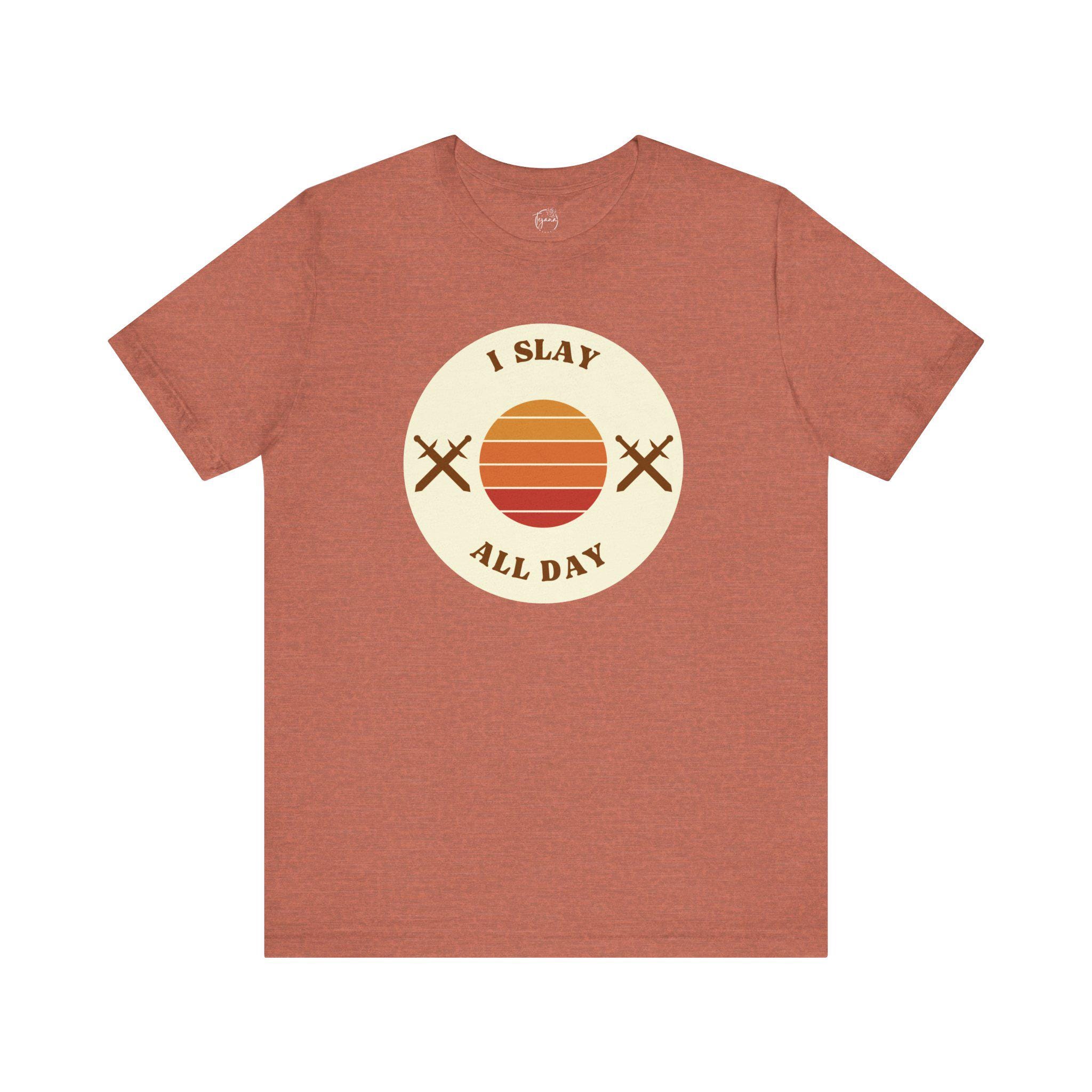This trendy T-Shirt is perfect for the hard-working and ambitious individual who's always on the go. With the stylish phrases 'slay all day,' printed on the front, this tee exudes confidence and motivation. Whether you're heading to work, running errands, or relaxing at home, this T-Shirt is a versatile wardrobe staple. Ideal for women celebrating success and empowerment, this tee is great for everyday wear, casual outings, and work-from-home attire.