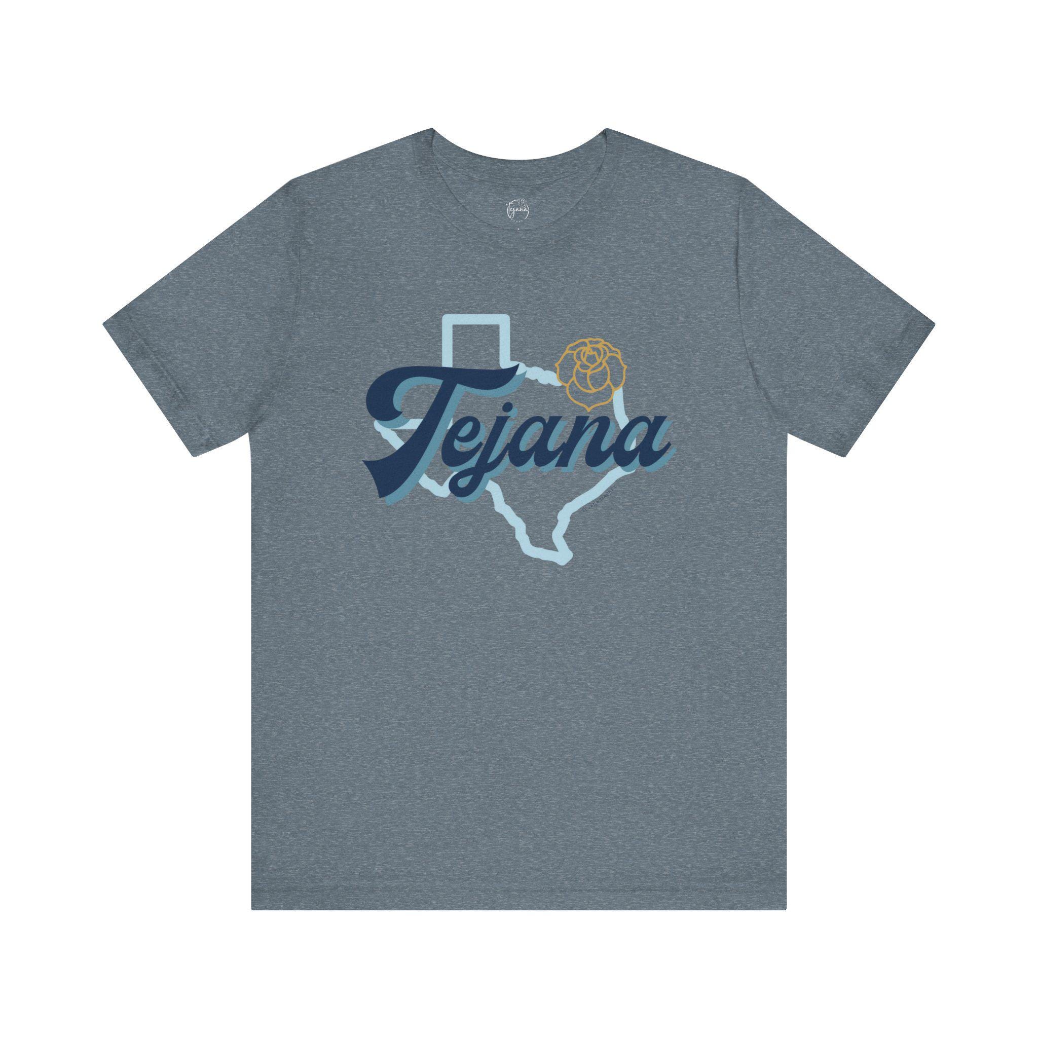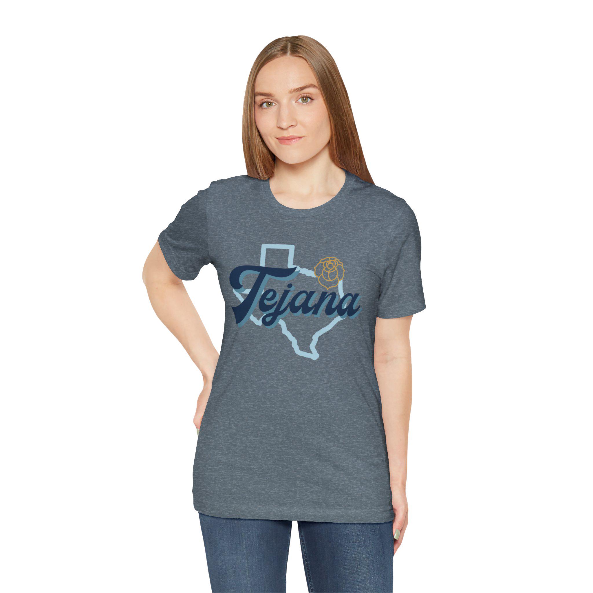 A Tejana-inspired unisex jersey short sleeve tee featuring a Texas and Hispanic cultural design with a yellow rose. This t-shirt exudes a sense of pride and heritage, making it a perfect addition to a casual wardrobe. Ideal for those who appreciate Texan and Hispanic culture, this tee is great for wearing during Texas-themed parties, Hispanic heritage celebrations, or everyday wear.