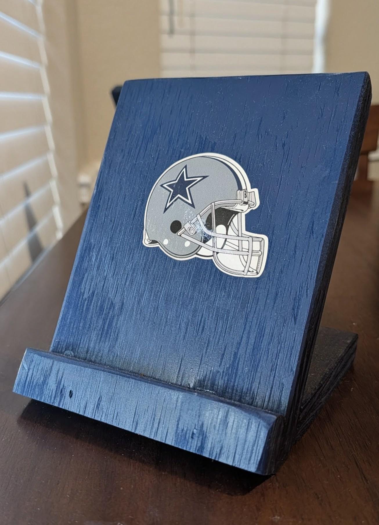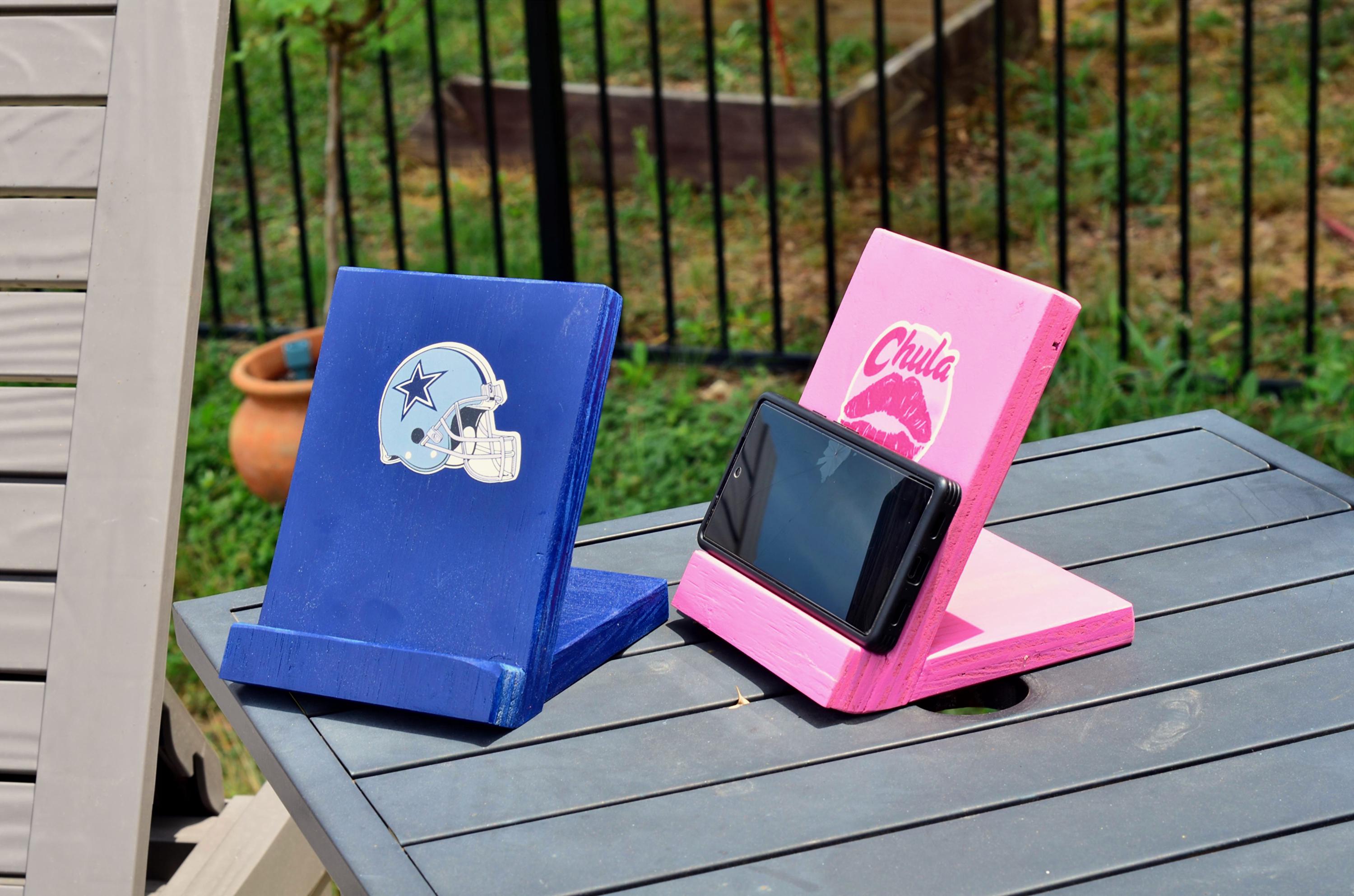Durable device stands can be used for devices or books. Sturdy and made out of wood, painted, and added decal.
